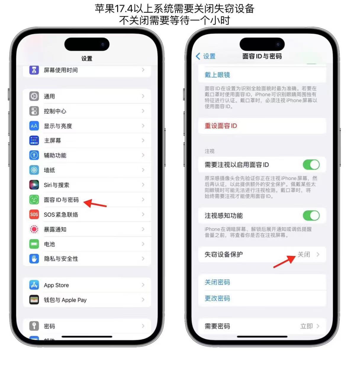17.4及以上:设置 → 面容ID与密码 → 关闭失窃设备保护